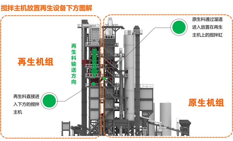 5.搅拌主机设置在再生设备正下方,使高温RAP可直投进入搅拌主机中。此项技术为铁拓机械2010年专利技术(铁拓机械专利号:ZL 2010 2 0119177.0)。经过铁拓机械工程师近十年来的实际应用验证,此项技术完全解决了高掺配比状态下高温再生料黏附输送设备和投料速度慢的问题。为行业共性难题提供了完美的解决方案。