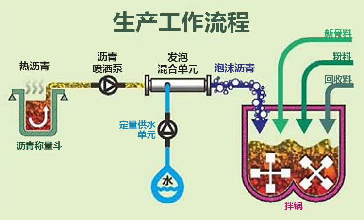 在沥青进入拌缸前,利用高压雾化水与热沥青进行对撞,诱发沥青发泡形成沥青微泡沫,通过微泡沫形成的沥青薄膜结构来实现较低温度下对集料的裹覆以及降低沥青混合料操作温度。