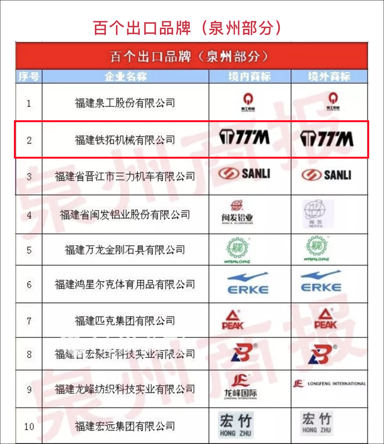 铁拓机械上榜福建省“百个出口品牌”