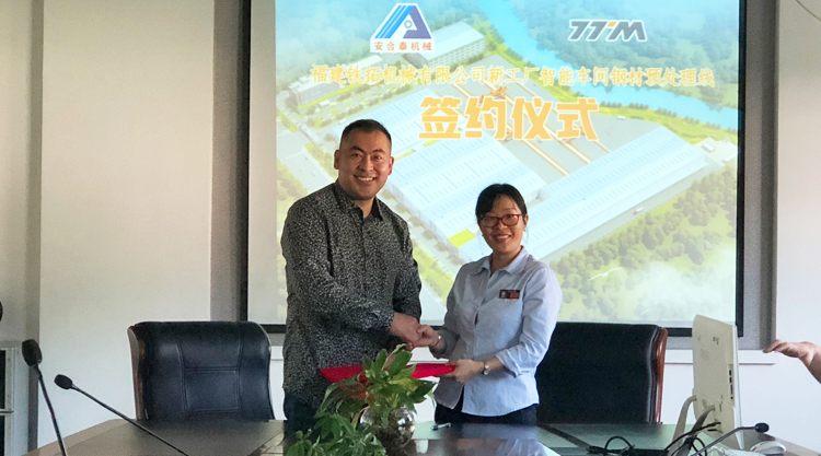 11月11日上午,福建铁拓机械有限公司与青岛安合泰机械制造有限公司正式签约,就新工厂智能车间的“钢板预处理生产线”项目计划达成共识。