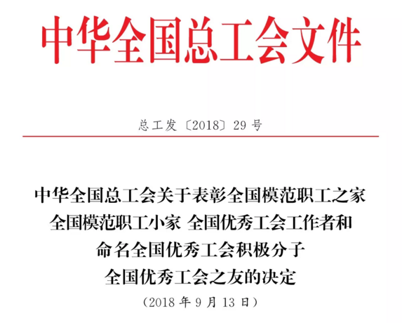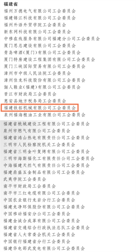 近日,全国总工会印发了《关于表彰全国模范职工之家 全国模范职工小家 全国优秀工会工作者和命名全国优秀工会积极分子 全国优秀工会之友的决定》文件。其中,福建省有70个集体、73位个人受到全国总工会表彰,铁拓机械荣获“全国模范职工之家”称号。