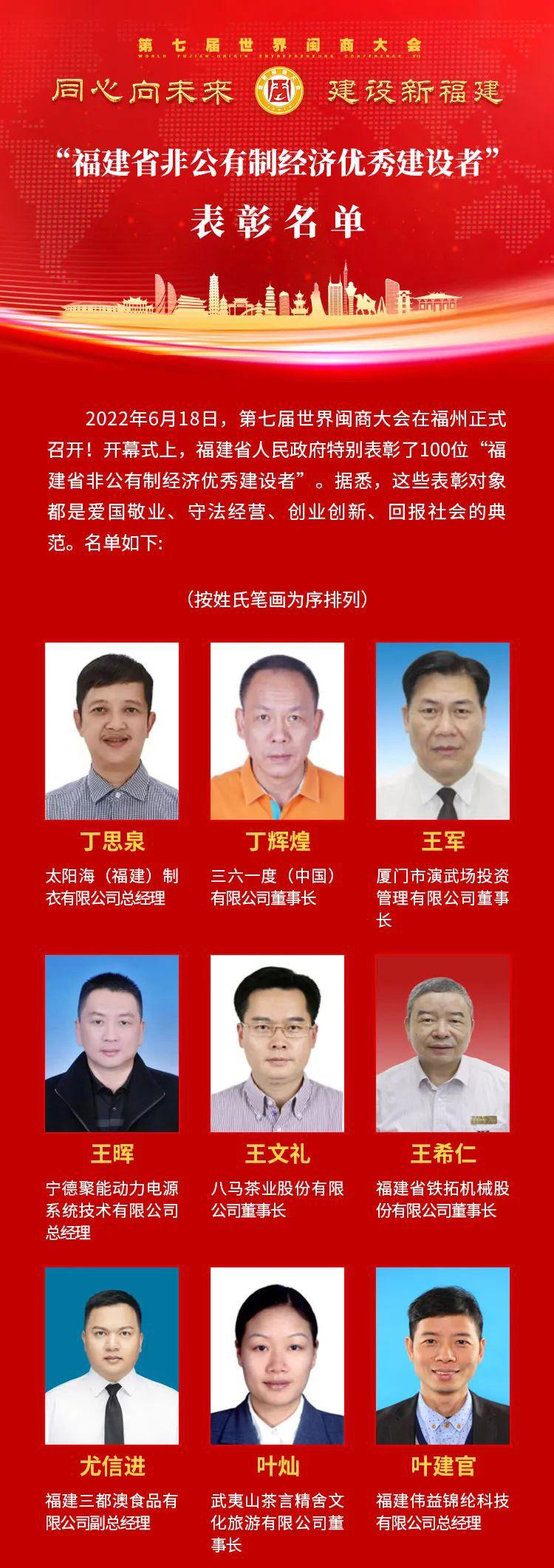 近日,福建省人民政府评定福建省非公有制经济优秀建设者100人,表彰自2019年第六届世界闽商大会以来,福建省非公有制经济人士坚持以习近平新时代中国特色社会主义思想为指导,大力传承弘扬“晋江经验”,勇于改革创新,争做时代先锋,为推动全省经济社会各项事业发展作出的重要贡献。