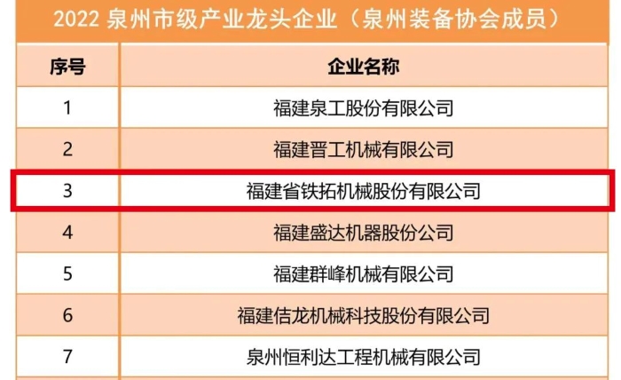 铁拓机械入选2022泉州市级龙头企业名单
