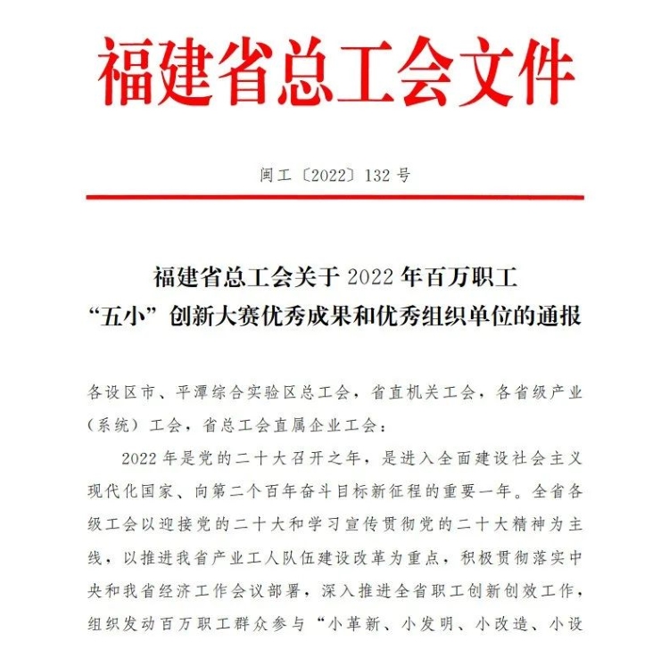 为学习宣传贯彻党的二十大精神,推进福建省产业工人队伍建设改革,深入推进全省职工创新创效工作,福建省总工会组织发动百万职工群众参与 “小革新、小发明、小改造、小设计、小建议”创新大赛。本次活动共发动企业5.6万余家,275万余人次参与大赛,申报项目逾85万余项。项目涉及农林水利、信息产业、能源及原材料、轻工烟草、机械制造、高新技术等行业的发明创造、技术创新、技术改造和技术突破。铁拓机械优秀职工,凭借出色的知识水平及扎实的技术功底,在本次活动中屡创佳绩!