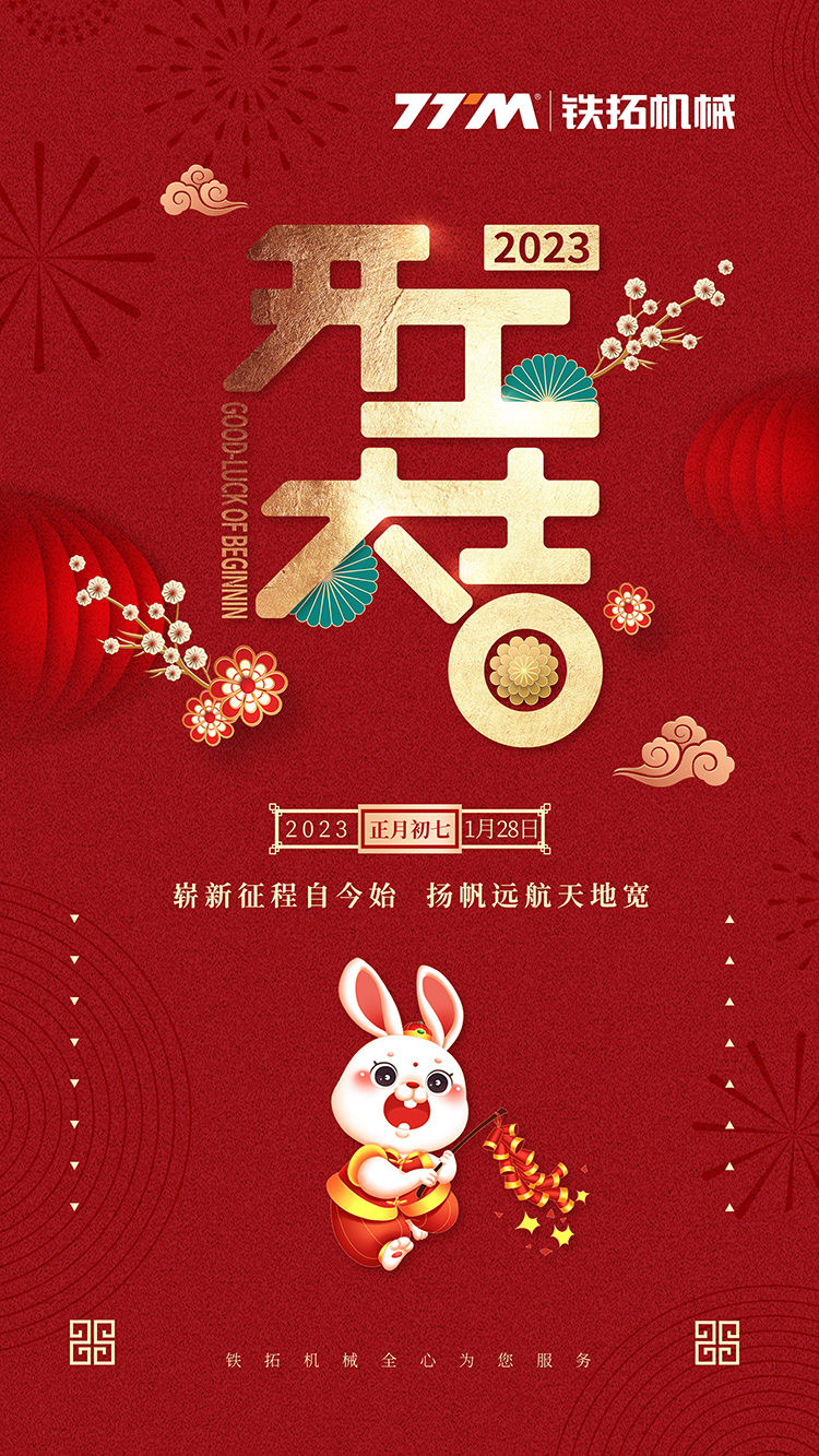 返回列表 28 2023-01 正月初七 | 铁拓机械,开工大吉! 2023-01-28 访问量:2544 访问类型:公司新闻 字号 A- A A+ 新年伊始,正月初七。铁拓机械,开工大吉!春节热闹还未远去,新的征程已经开启!2023,我们将以全新的姿态,满怀饱满的热情,为客户创造最大价值,谱写更加辉煌的篇章! 上一条 为者常成 行者常至 | 铁拓机械2022年年度营销会议隆重举行 2023.02.02 下一条 前“兔”似锦 | 铁拓机械恭祝广大客户朋友新春快乐! 2023.01.21