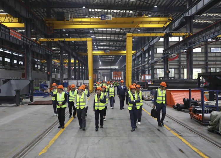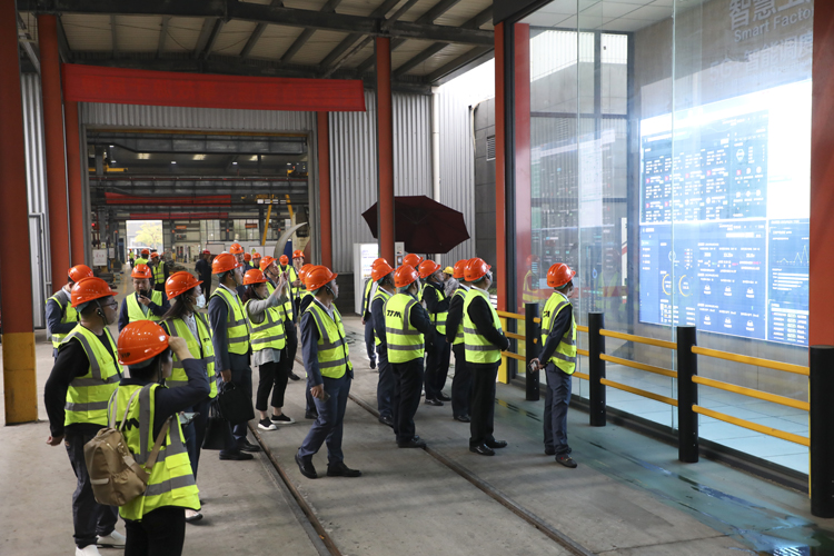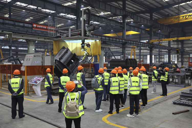 交流结束后,协会考察团一行领导走进铁拓机械智能化车间,近距离观摩大智能化机器人焊接等高端大型加工设备生产场景,了解沥青混合料搅拌设备的生产加工工艺流程以及品质把控。期间,一行领导还参观了铁拓机械“智慧工厂”5G+智能调度中心,了解铁拓机械在工厂利用5G信息化技术,对公司核心业务进行精细化、一体化管控,打造行业好产品。