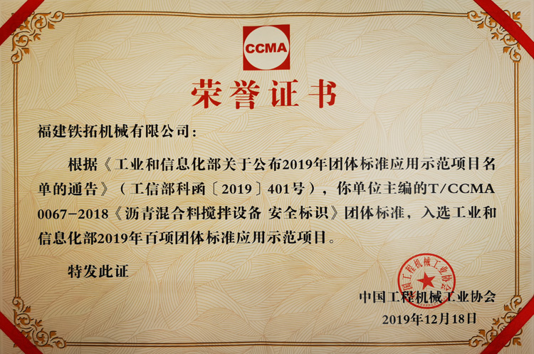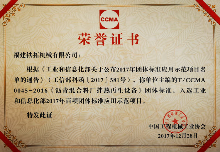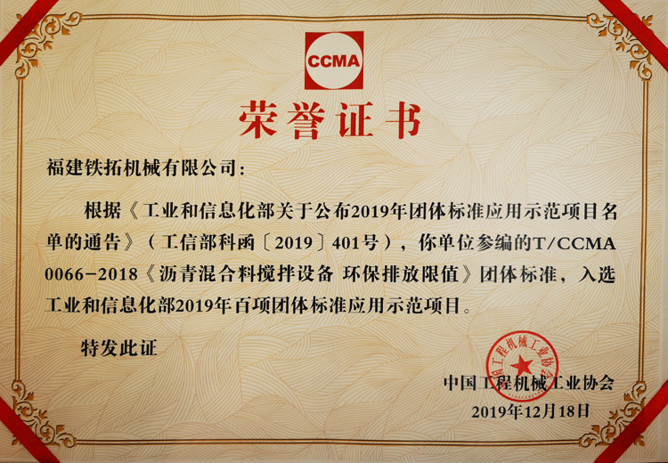 铁拓机械作为中国沥青混合料搅拌/沥青厂拌热再生设备行业标准的参与者与制定者,受邀参加此次盛会。并因作为主起草单位参编了多项行业团体标准,成功入选了此次“百项团体标准应用示范项目”,会上受到中国工程机械工业协会的表彰。