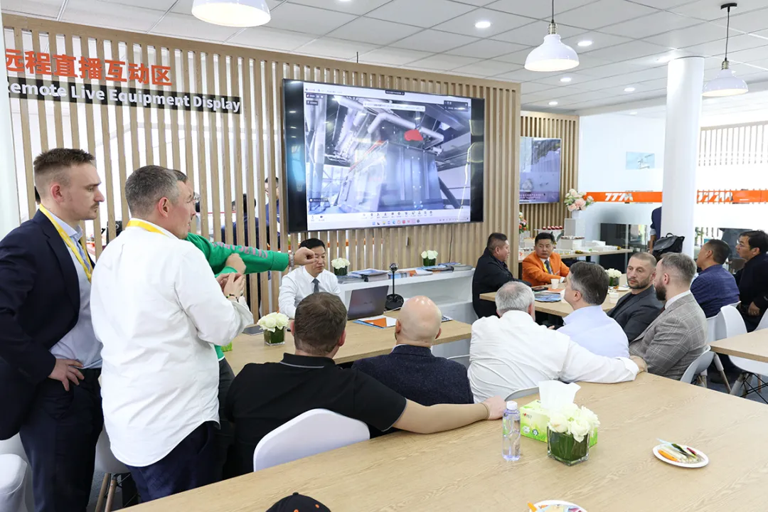 前来展台的国内外行业用户通过远程设备直播观看泉州展区,部分用户表示在展会结束后将前往铁拓机械实地考察观摩了解更多产品。