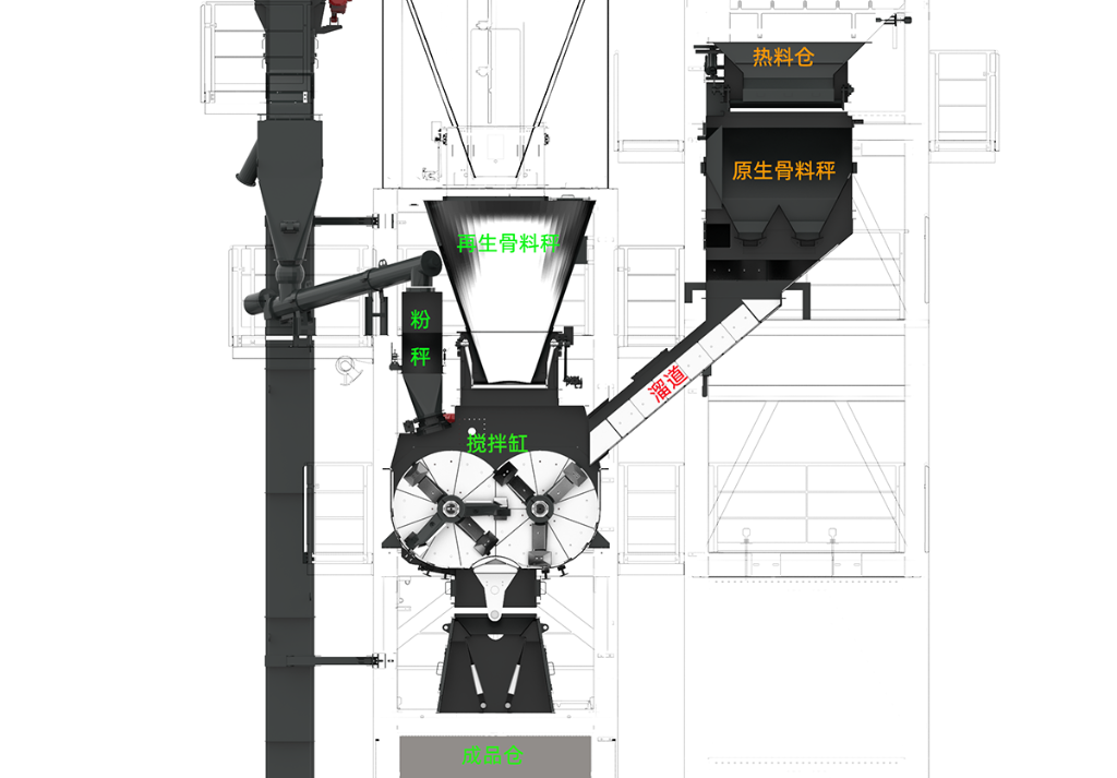 1. 一体机架构将搅拌缸直接置于再生骨料秤正下方,省去传统溜道投料,原生料则通过溜道精准投入,减少物料残留与浪费;