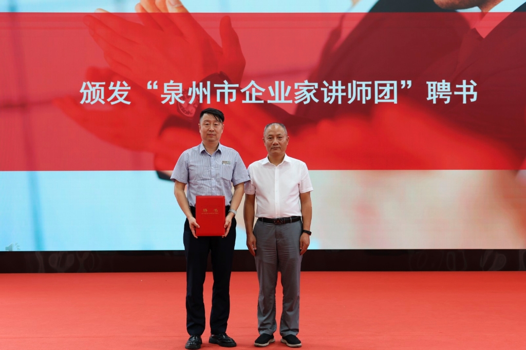 泉州市工业和信息化局调研员洪进科出席活动并致辞,强调泉州正持续推进“企业家素质提升培训专项计划”,鼓励企业走“专精特新”高质量发展之路。随后,洪进科调研员向铁拓机械总经理高岱乐颁发聘书,正式聘任高岱乐总经理为“泉州市企业家讲师团成员”。